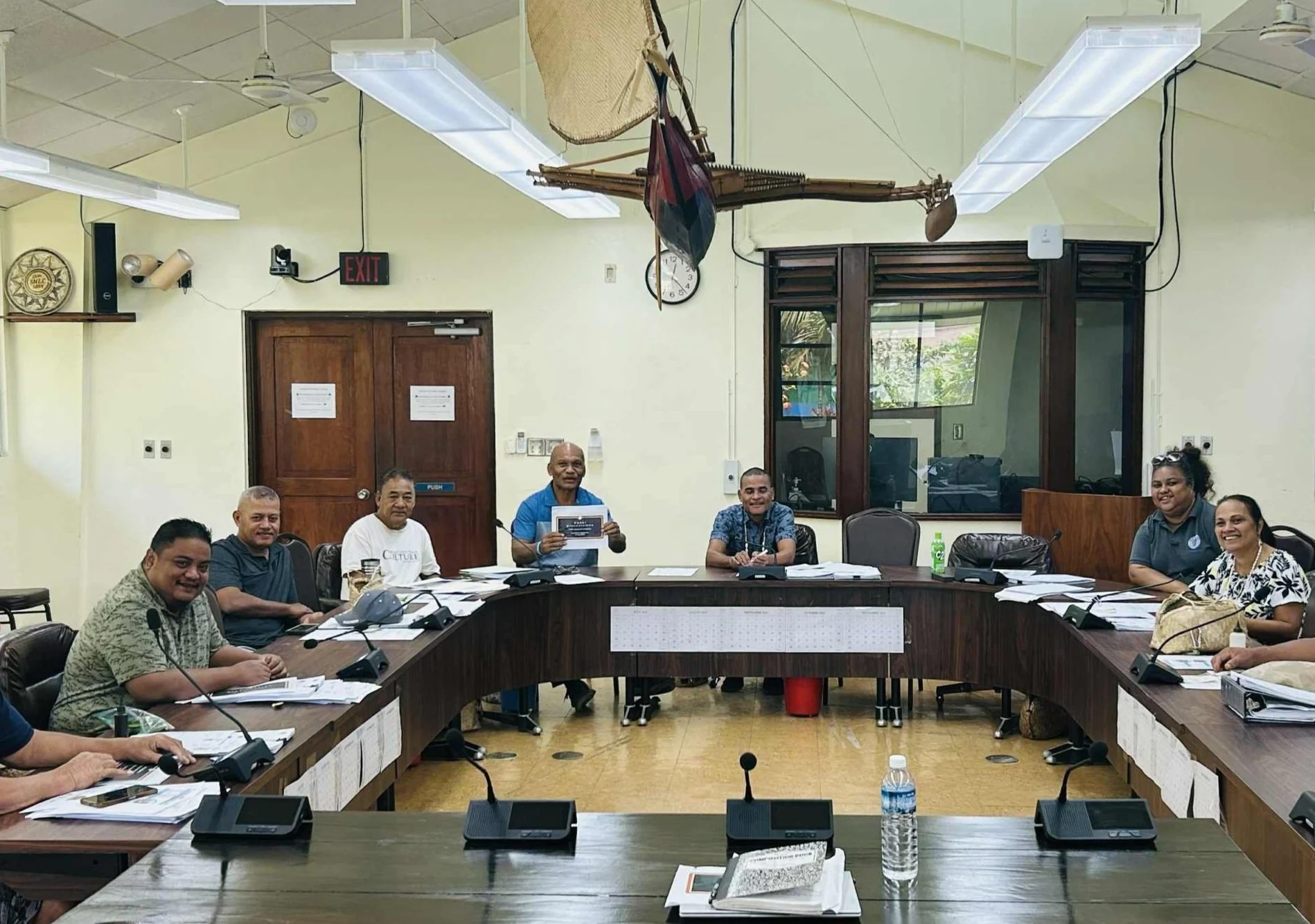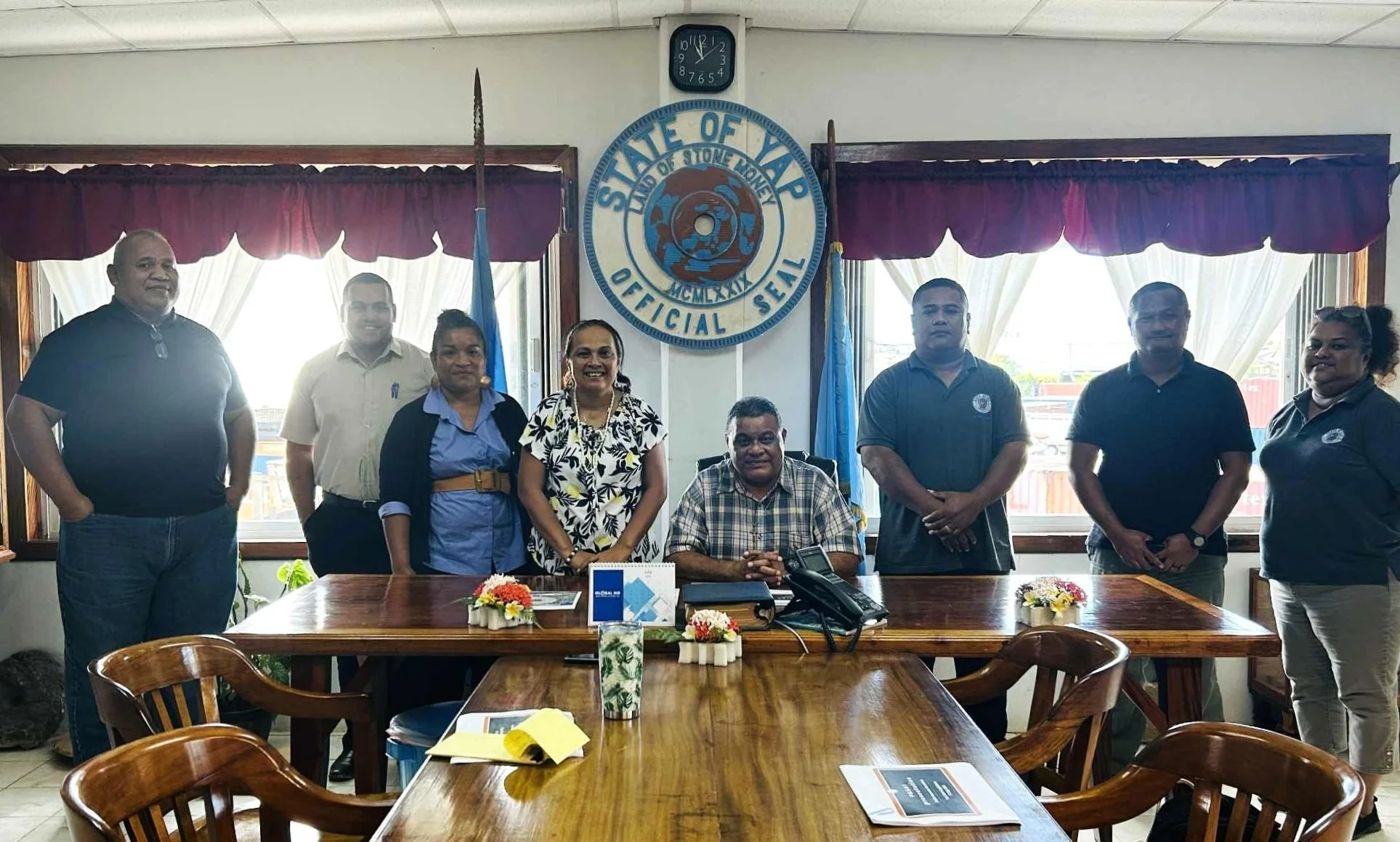 PASAI Program Director, Sophia H Pretrick (fourth from left); Public Auditor, Bryan Dabugsiy (third from right); and Chief Investigator, Marie Laamar (far right); meeting with Acting Governor, Francis Itimai (seated, centre); and other Cabinet members